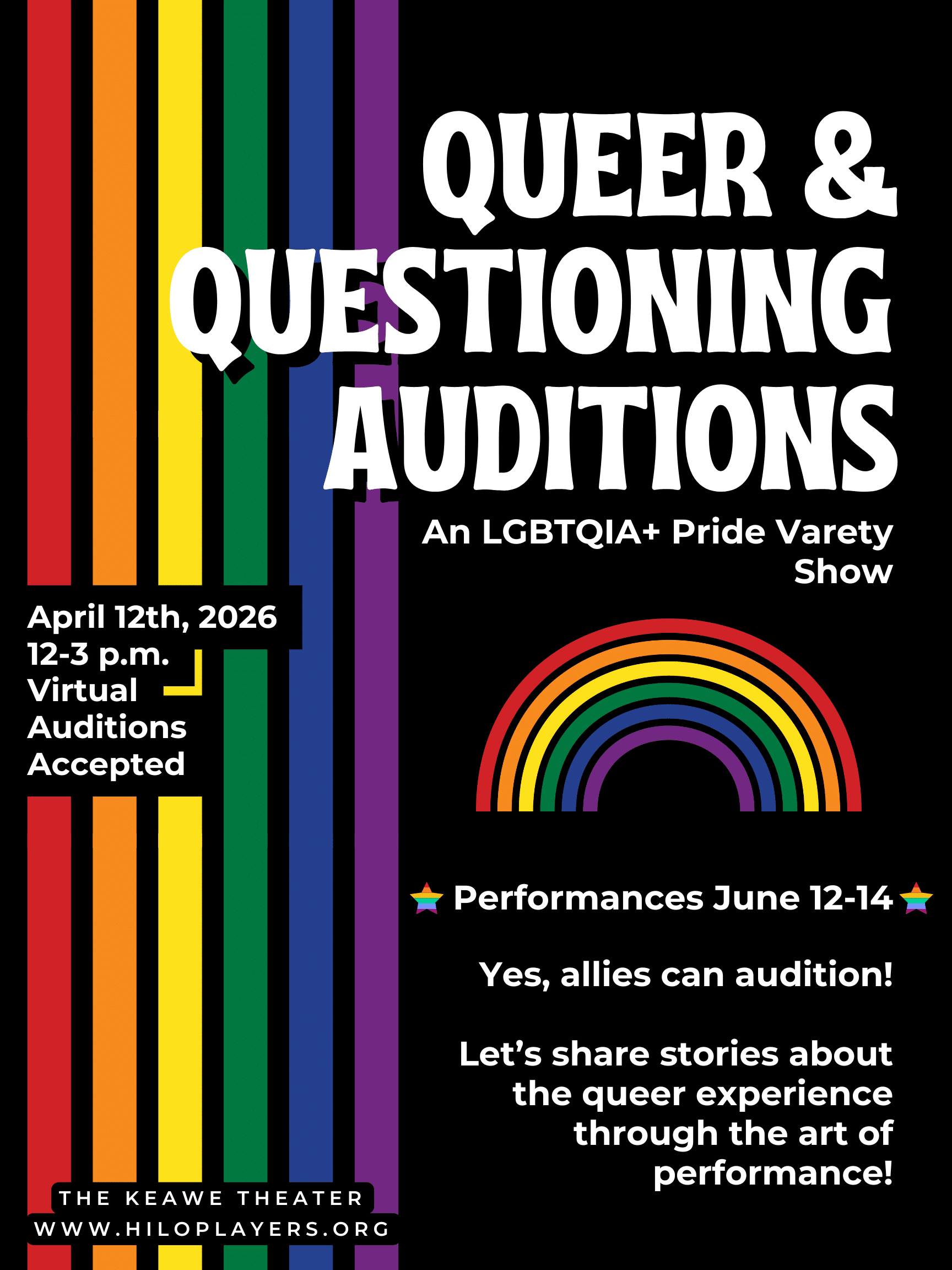 Virtual Auditions considered for those that cannot attend. Please contact us at hilocommunityplayers@gmail.com