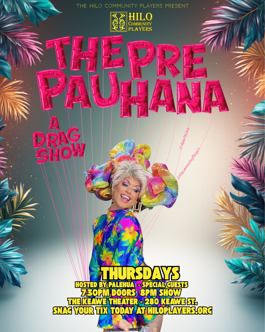 Join us for The Pre Pau Hana, a fabulous weekly drag show hosted by the dazzling Palehua and featuring a rotating lineup of fierce guest queens from across Hawai‘i and beyond. Presented by Hilo Community Players, this show serves up laughter, glamour, and high-energy performances that are the perfect kickoff to your weekend.